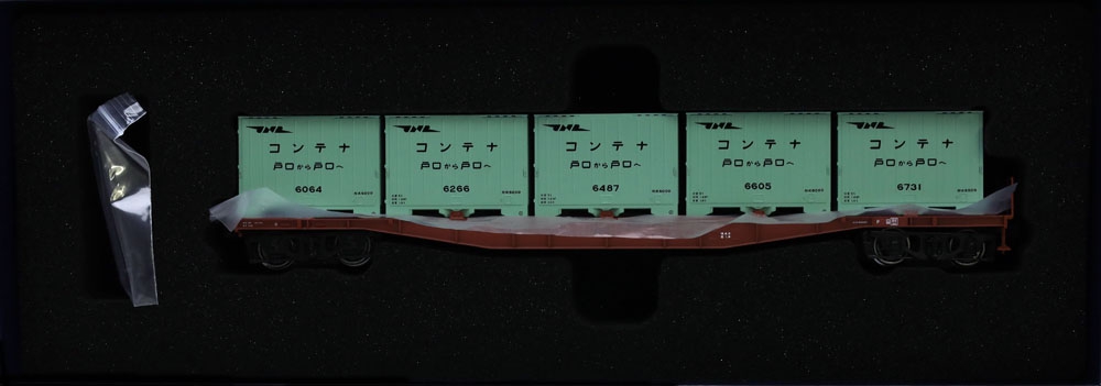| ■商品説明 | 1959年(昭和34年)11月、初のコンテナ専用列車「たから」が汐留駅-梅田駅間に登場しました。 この列車が好評だったことから鉄道コンテナの運行が全国へと拡大していきます。 「たから」は編成単位の運用で途中駅での分割や入換がないため、当初用いられたチキ5000形(後のコキ5000形)はデッキや手摺がなく、留置用の手ブレーキが車体側面に設置されていました。 しかし運用範囲が広がるに連れて一般貨物列車との併結や途中駅での入換が発生するため、デッキと手摺を設け、車上でブレーキ操作を行えるよう改良を施すことになりました。 こうして1960年(昭和35年)に誕生した増備車がチキ5500形です。 塗装はチキ5000形と同様に赤3号ですが、上記の改良により台枠を350mm延長、台車はTR63からTR63Aに変更されました。 運転最高速度85km/h、最大積載5tコンテナ5個は変わらず、チキ5000形と共に「たから」にも連結され活躍しました。 1965年(昭和40年)、 称号改正によりチキ5500形はコキ5500形となります。 翌年の落成車からは工法を見直し、側面の縦補強を片側4本に削減したことで外観が大きく変化しました。 当形式は製造期間が長かったこともあり、台枠構造や台車形状に多くのバリエーションが見られます。 その後も増備が続いたコキ5500形は、1970年(昭和45年)までに合計 3,146 輌(コキ5000形からの編入車も含む)が製造され、全国の鉄道コンテナ輸送に大きく貢献しました。 |