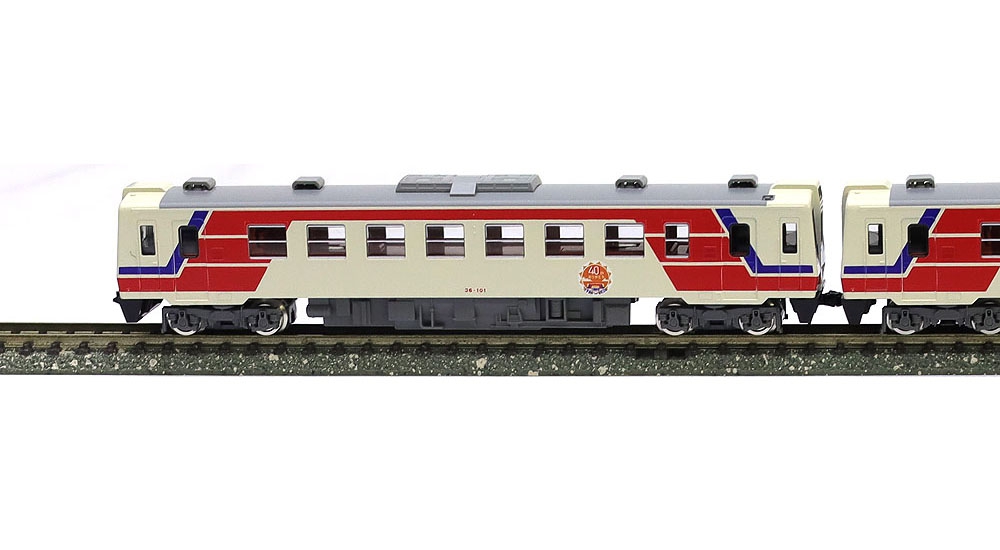 | ■備考 | 動力付き 2024年に登場から40年を迎える三陸鉄道36形を車体新規製作でリニューアル 車体側面の三陸鉄道40周年ロゴマークは印刷済み 車番は印刷済み ヘッド テールライト 前面表示部は常点灯基板装備、ON-OFFスイッチ付 ヘッド テールライトは電球色LEDによる点灯 前面表示部はカラープリズムの採用で白色に近い色で点灯 36-202のヘッド テールライト 前面表示部は片側のみ点灯 前面表示部は行先シール付属 フライホイール付動力採用 新集電システム、銀色車輪採用 TNカプラー(SP)装着済み M-13モーター採用 ミニカーブ通過可能 (連結運転時は連結面にカプラーアダプター使用) |