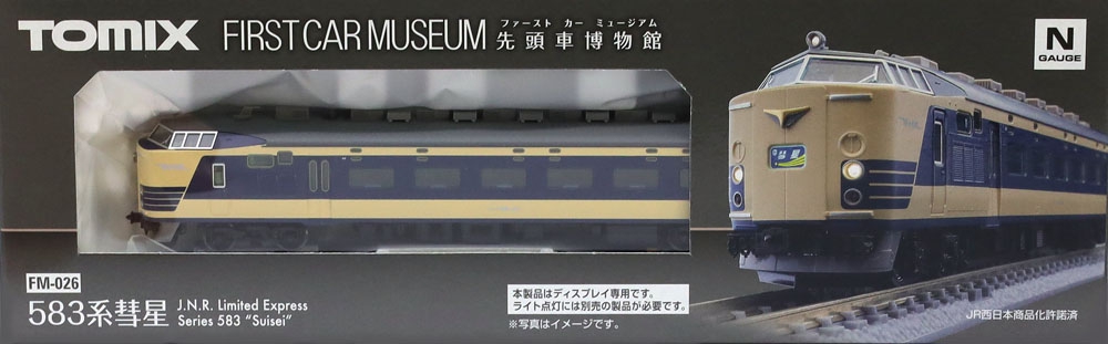 | ■備考 | 手軽に精密なNゲージ鉄道模型をディスプレイして楽しめるファーストカーミュージアム製品 583系特急電車のうちクハネ581を再現 ヘッド テールライトは、別売りのFM-017電源ユニット、パワーユニット D.C.フィーダーを使うことで点灯 ヘッド テールライト トレインマークは常点灯基板装備 ヘッド テールライト トレインマークは電球色LEDによる点灯 トレインマークはカラープリズムの採用で白色に近い色で点灯 印刷済みトレインマーク「彗星」装着済み 黒色車輪採用 すぐにディスプレイ可能なストレートレールS158.5(F)付属(印刷無し) ストレートレールS158.5(F)は従来のファイントラックと接続可能 転がり防止用の車輪止めパーツ装着済み ※パワーユニットによる運転走行はできません ※カプラー無しの為、連結はできません |